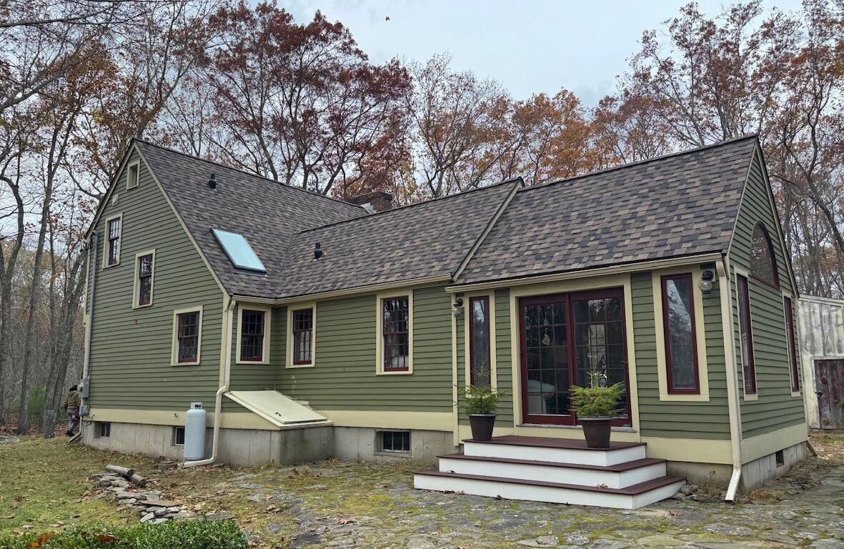Kathryn in Baltic, CT, reached out to us after noticing water spots forming on her ceiling, a clear sign of a roof leak. Wanting to take care of the issue before it got worse, she contacted Klaus Larsen Roofing after being referred by her aunt, whose roof we replaced earlier this year. Our team inspected the home and confirmed that a full roof replacement would be the best long-term solution to stop the leaks and protect the home. We removed the old roofing system and replaced any damaged plywood before installing a complete Klaus Larsen Roofing system. For the new roof, Kathryn chose IKO Dynasty shingles in the color Brownstone, a timeless look that complements her home beautifully. We also added a Velux M08 Skylight to bring more natural light into the space while maintaining proper insulation and water protection. Now, Kathryn’s home not only looks refreshed but is fully protected from future leaks, giving her peace of mind for years to come.