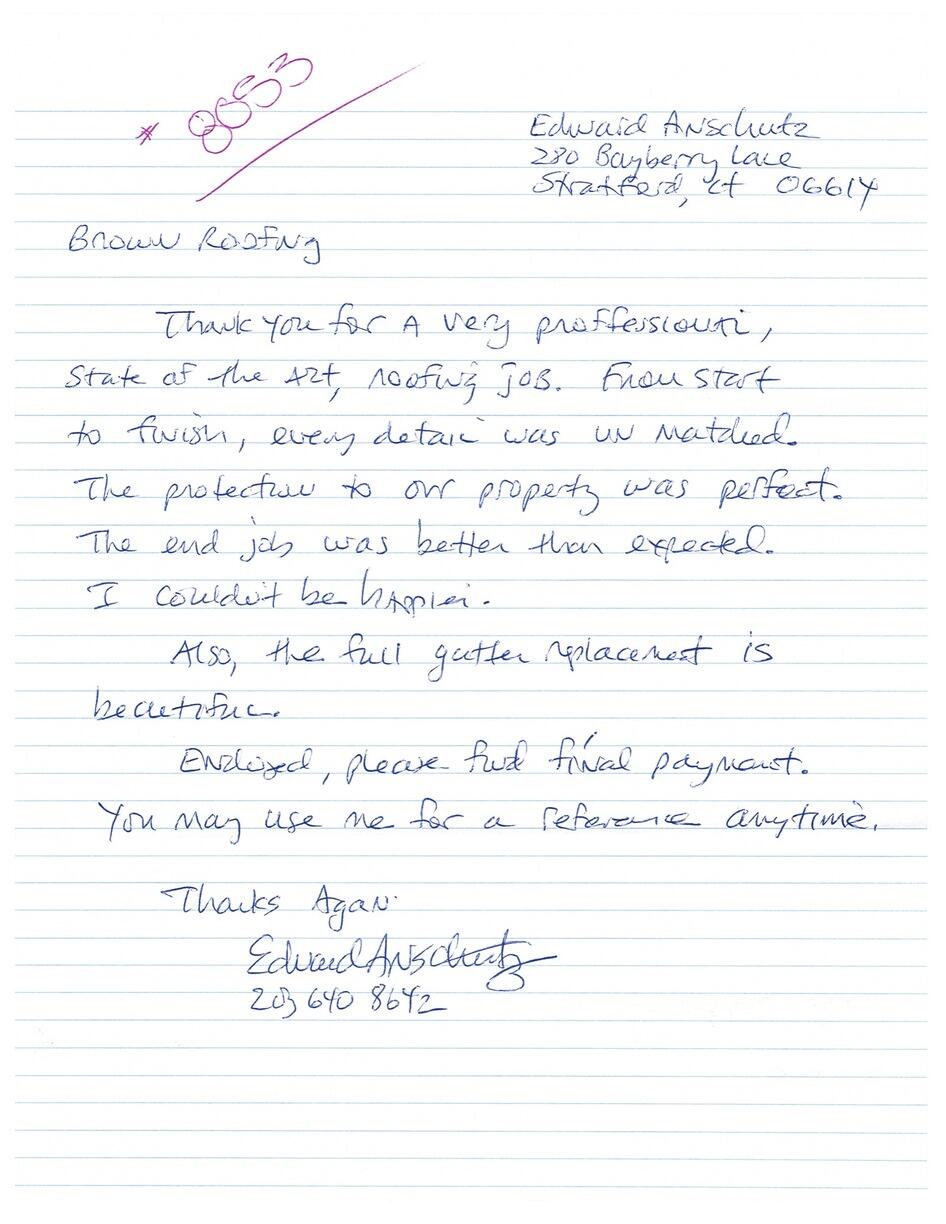 Thank you for a very professional, State of the Art, roofing job.From start to finish, every detail was unmatched.The protection to our property was perfect.The end job was better than expected.I couldn't be happier.Also, the full gutter replacement is beautiful.Enclosed, please find final payment.You may use me for a reference anytime.