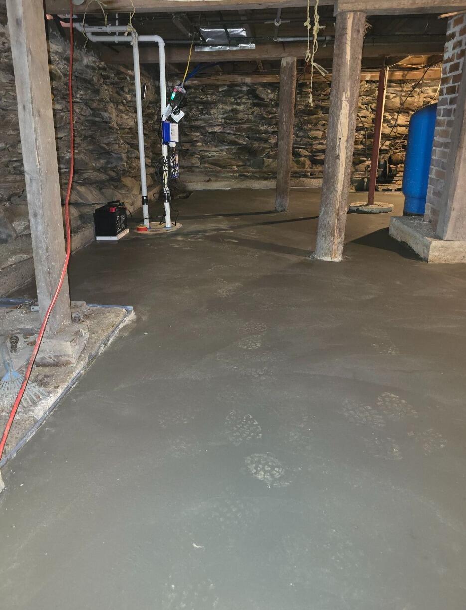 Winslow, ME homeowners were inundated with water in their basement, especially in the springtime when the snow would melt. They called TC Hafford Basement Systems for a free estimate on improvements to keep their basement dry. We upgraded their dirt floor basement to a new slab floor, complete with WaterGuard perimeter drainage system. We also installed a new TripleSafe sump pump, the top of the line pump system. WaterGuard collects water and channels it directly to the TripleSafe to be pumped away from the home through an exterior buried discharge line. The discharge line has IceGuard installed to prevent it from freezing up in the winter months. The homeowners no longer have to battle trying to clean up water in their basement!